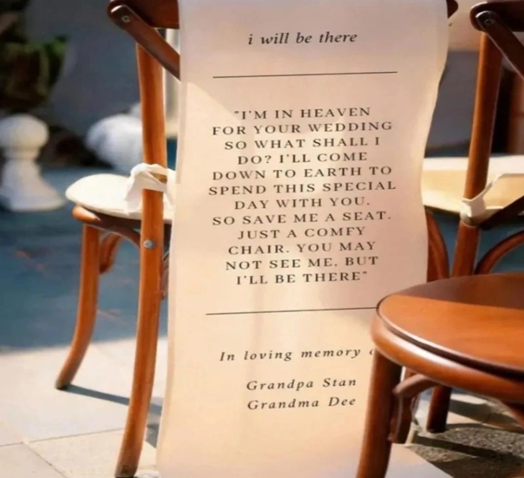 Memorial signs placed on a chair offer a deeply personal and poignant way to reserve a space for a loved one who is dearly missed. Typically positioned in the front row during the wedding ceremony. This gesture serves as a powerful visual reminder of their presence in spirit, symbolically giving them the "best seat in the house" to witness the couple's vows. It provides a sacred space for the fami